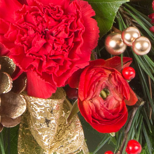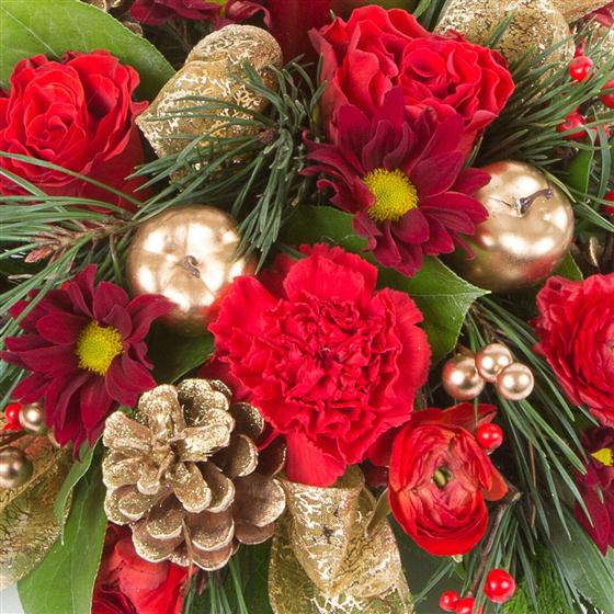 A traditional favorite, this spruce arrangement including cones and berries is perfect as a table centre. Flower content will vary from day to day with fresh flowers from the auctions picture showes medium size
