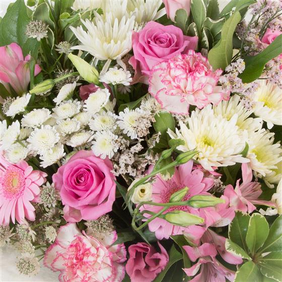 Our most popular bouquet, a collection of blooms in shades of pink and cream, hand-tied and finished with a complementary wrap