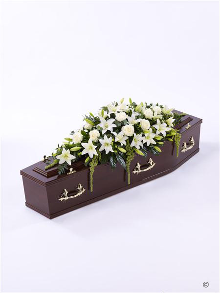 Beautiful Asiatic Lily and large-headed Rose in pure white are used to create this elegant casket spray. The fresh flowers are enhanced with trails of green amaranthus as well as ruscus, aralia leaves and eucalyptus. Approximate height 122cm (4ft).