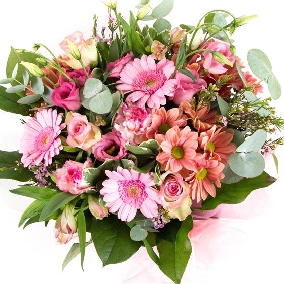 A mixed pink hand-tied bouquet picture shown is for the large size flower content may vary