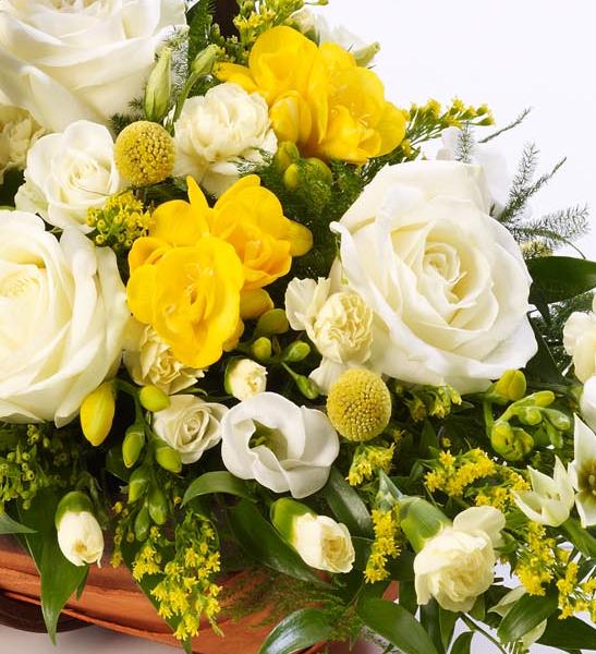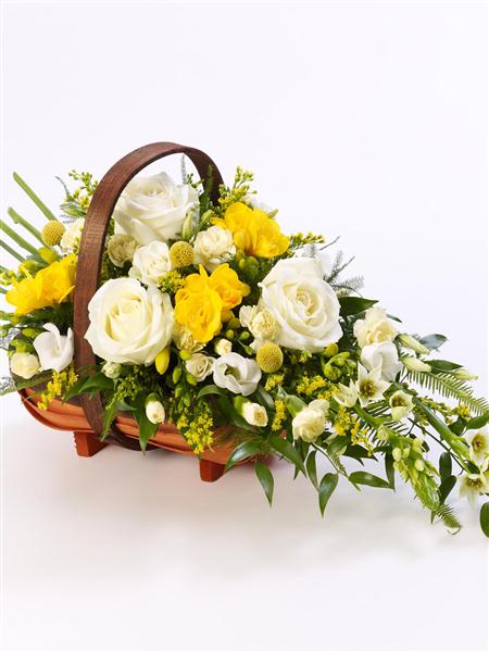 A traditional trug basket filled with roses, scented freesia, craspedia, spray carnations and ornithogalum in white and yellow arranged in a sheaf-like design.