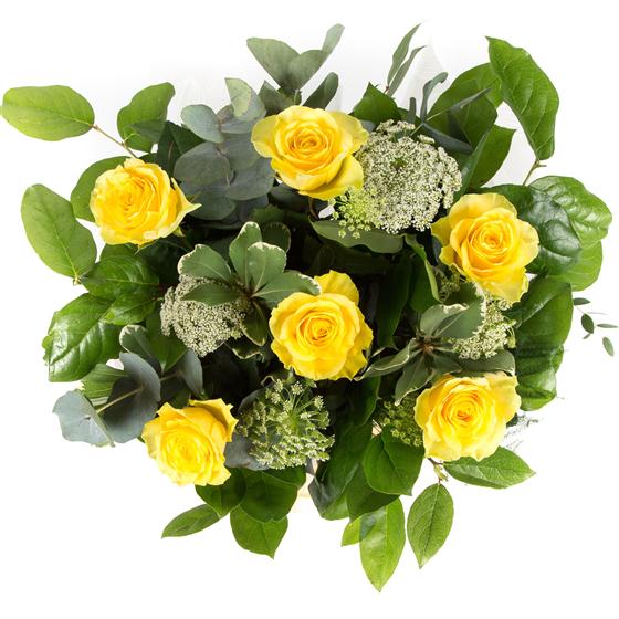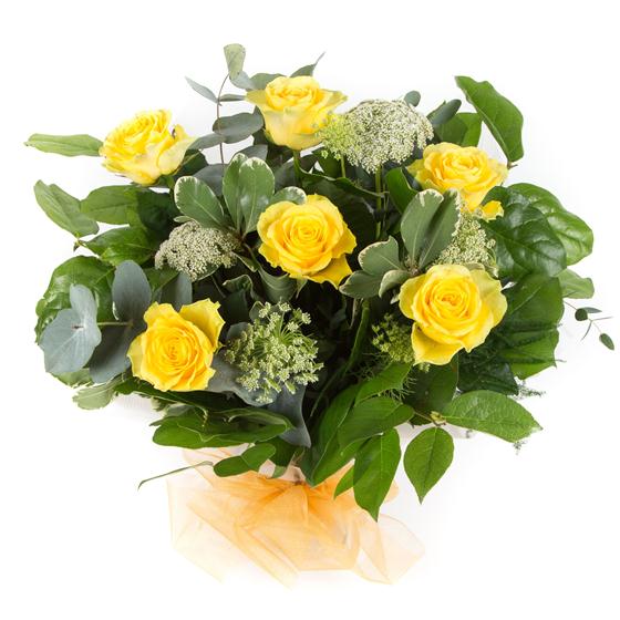 A hand-tied bouquet of long stemmed golden yellow roses complemented with varigated foliage delivered in a gift box